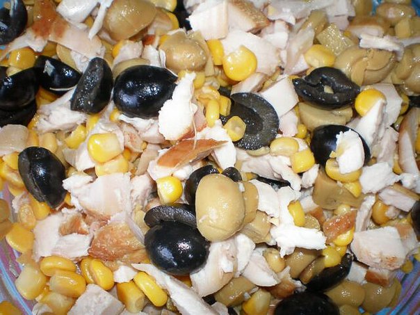 Обжариваем лук на сковородку с маслом и водой, чтоб он скорее даже тушился. Добавляем шампиньоны, 5 минут тушим. добавляем перчик, тушим 2 минуты. В конце кладем фасоль. Еще пару минут тушим. Все это в салатницу. Есть можно как теплым, так и холодным! Заправлять ничем не надо, т.к. тушится с маслом растительным или оливковым.
